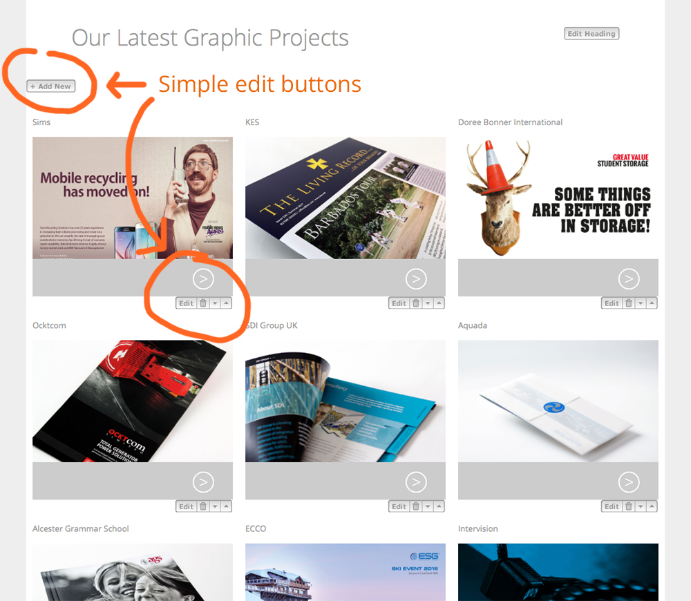 Repeating regions allow you to add news articles, testimonials or events with optional date field, photo and PDF file. You can arrange the order of your articles, as well as pulling one or several of these through to your homepage dynamically to keep your site updated. Our advanced repeating region allows you to add even more content with a link to view the entire article on a separate page. You can optional date field, multiple photos (with click to enlarge feature), multiple file uploads and embedded YouTube or Vimeo videos.